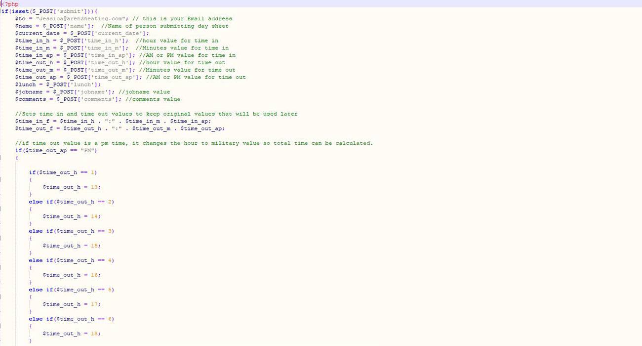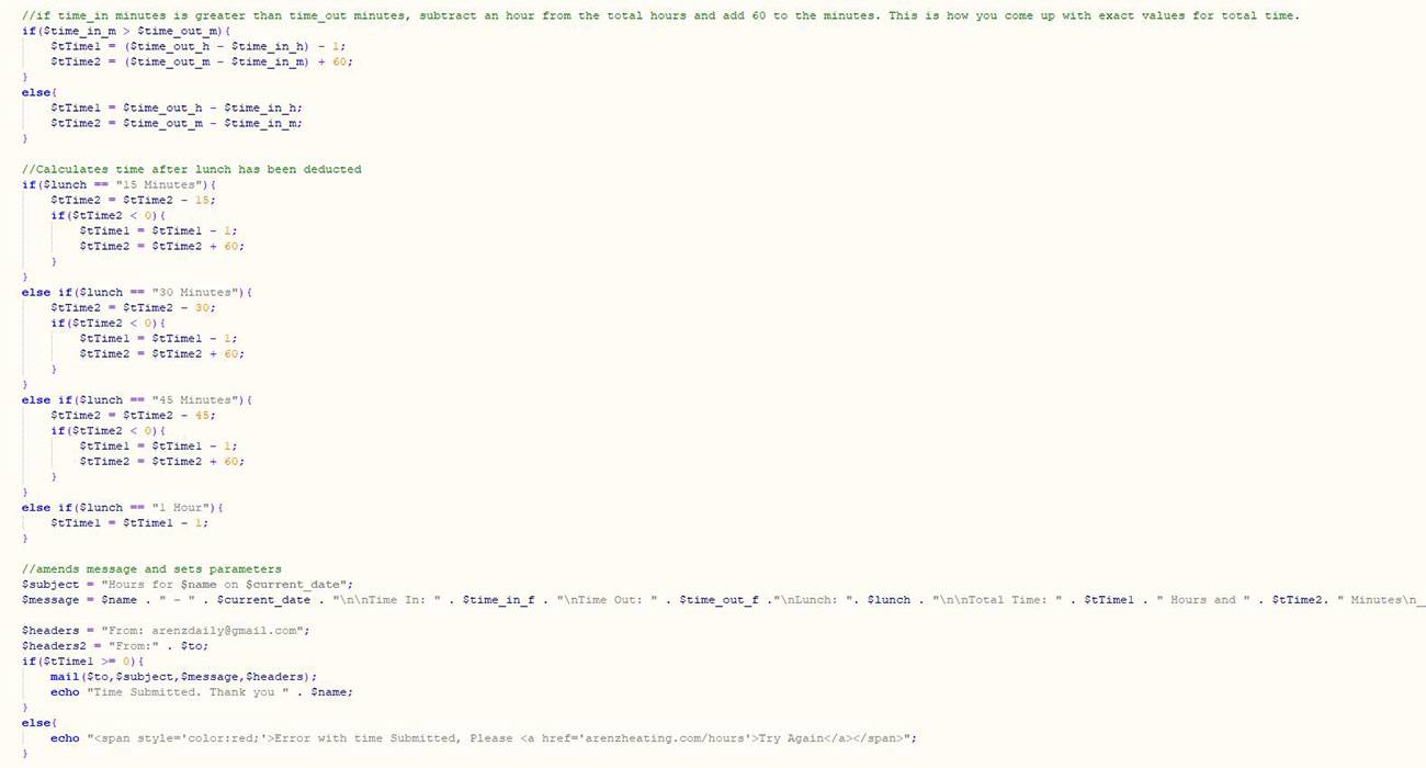 In order for the site’s CMS capabilities to be as user friendly as possible, the backend was set up to reflect the exact order of content on the front end. PHP was used to set a framework for the main page, while there were wysiwyg text editors underneath in which they could enter and edit each section separately. It was also requested that the website be utilized as a tool for their employees to enter their hours. There is a password protected page that the employees had access to. They would enter their time in and their time out. Then that entry was ran through a script that determined the amount of hours, subtracted time for their break if necessary and then sent the results to their office for processing.