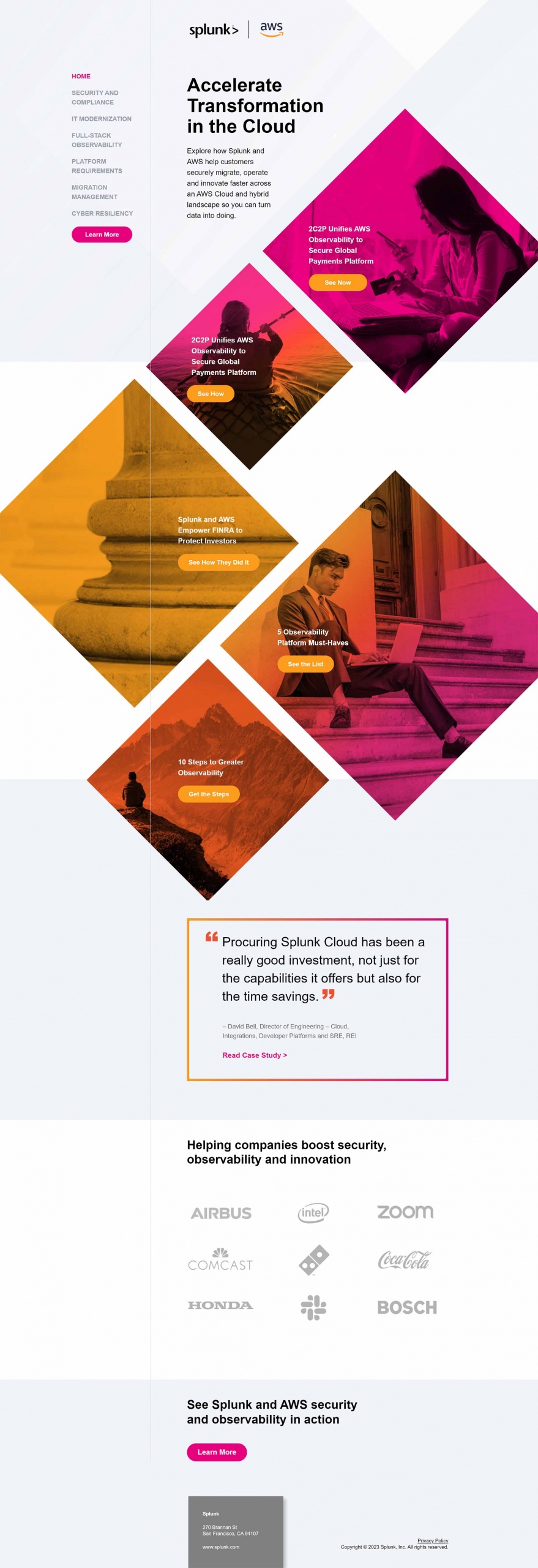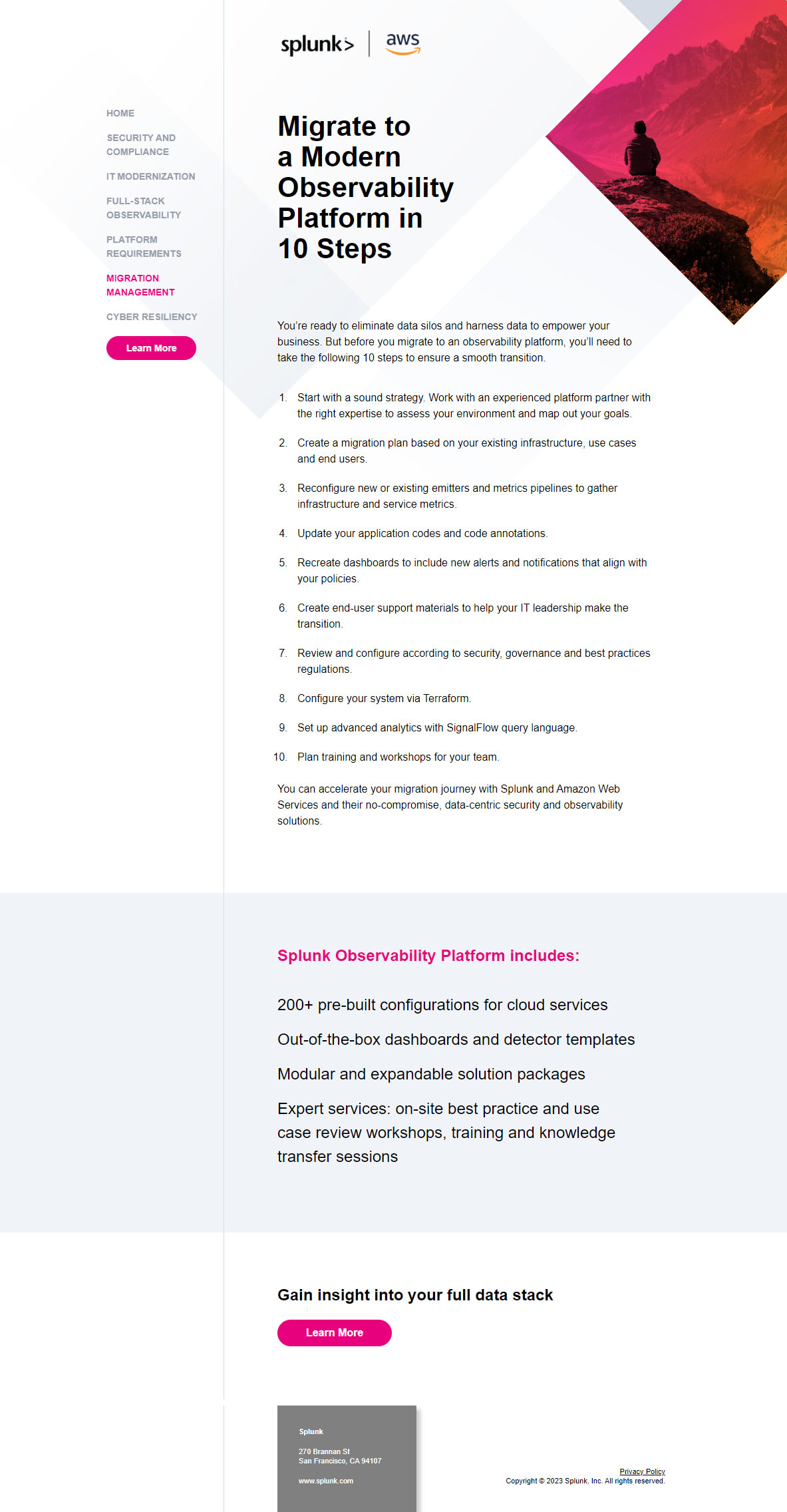 Splunk wanted a Microsite that captured leads for their new AWS campaign. The site needed to have its entire layout customized down to the last detail and be completely responsive. It featured a side navigation panel that could dynamically change depending on the current page and multiple forms that needed to have any leads generated sent to different data stores for delivery. Live version